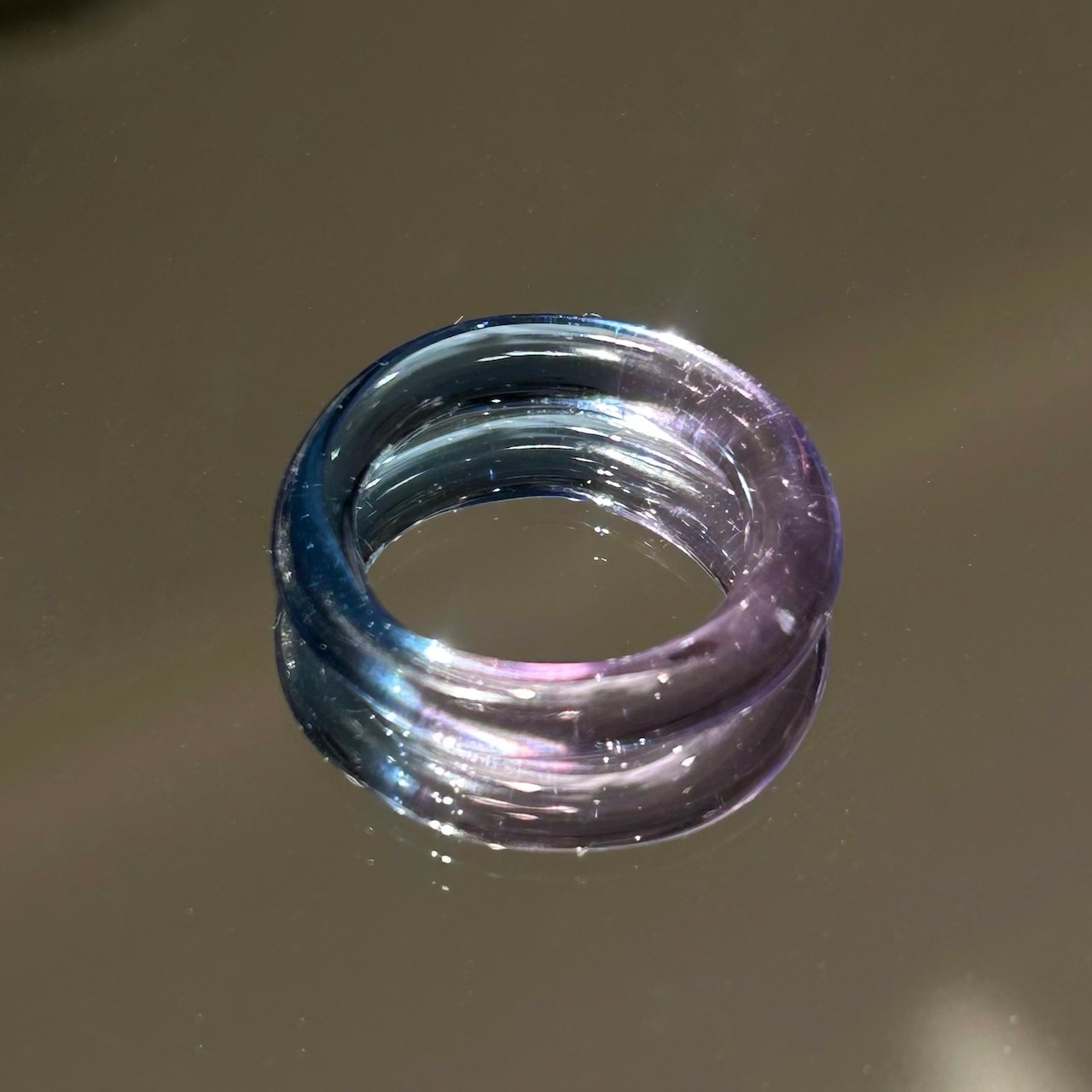 水色とパープルがにじむガラスリングです。